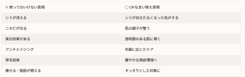 「美白」は使用NG、「シミが消える」もNG。「透明感のある肌に導く」はOKというケースが多い